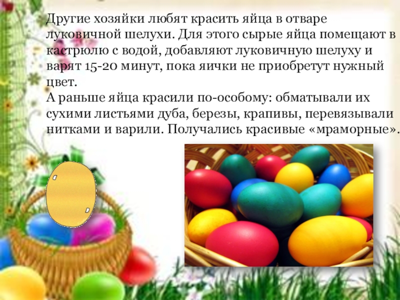 Слайд 20Другие хозяйки любят красить яйца в отваре луковичной шелухи. Для этого