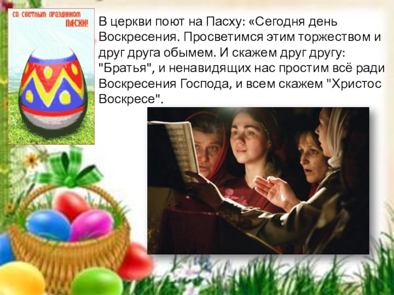 Слайд 10В церкви поют на Пасху: «Сегодня день Воскресения. Просветимся этим торжеством