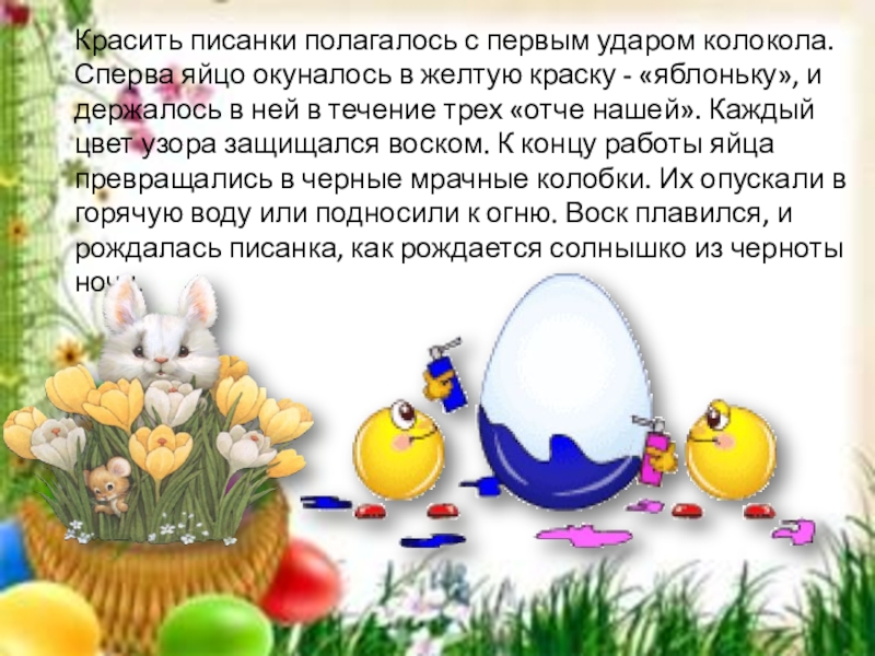 Слайд 25Красить писанки полагалось с первым ударом колокола. Сперва яйцо окуналось в