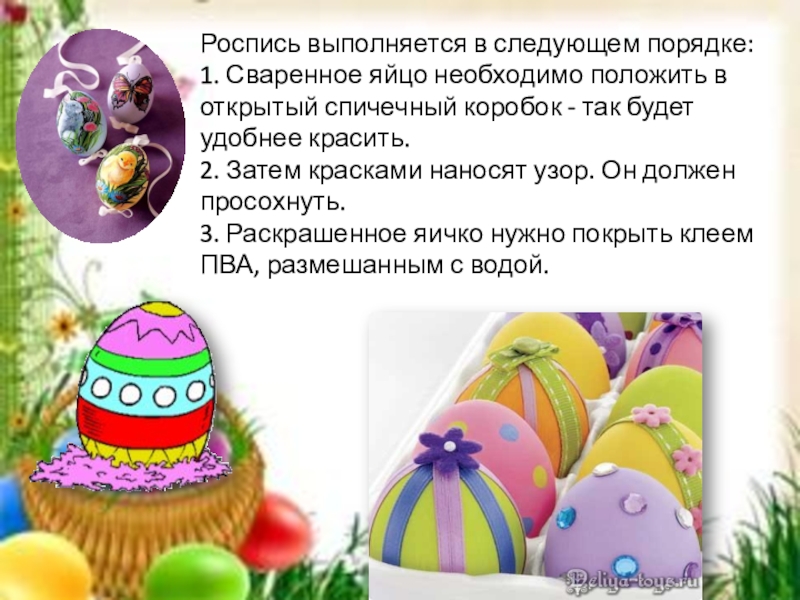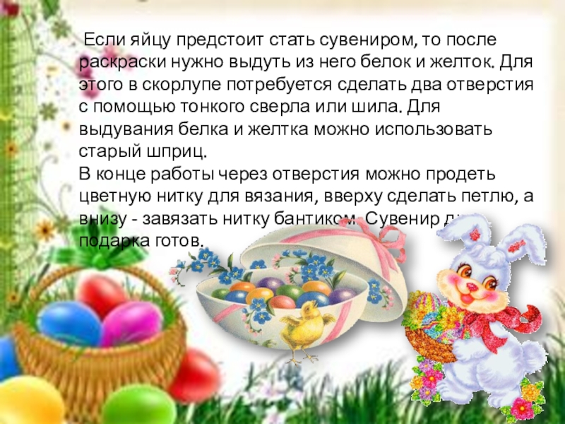Слайд 29 Если яйцу предстоит стать сувениром, то после раскраски нужно выдуть