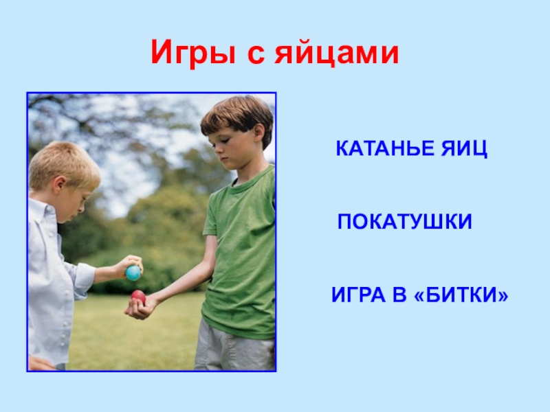 Игры с яйцамиКАТАНЬЕ ЯИЦПОКАТУШКИИГРА В «БИТКИ»