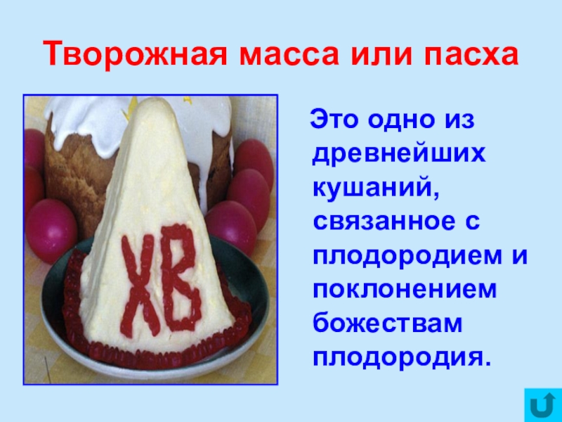 Творожная масса или пасха  Это одно из древнейших кушаний, связанное с плодородием и поклонением божествам плодородия.