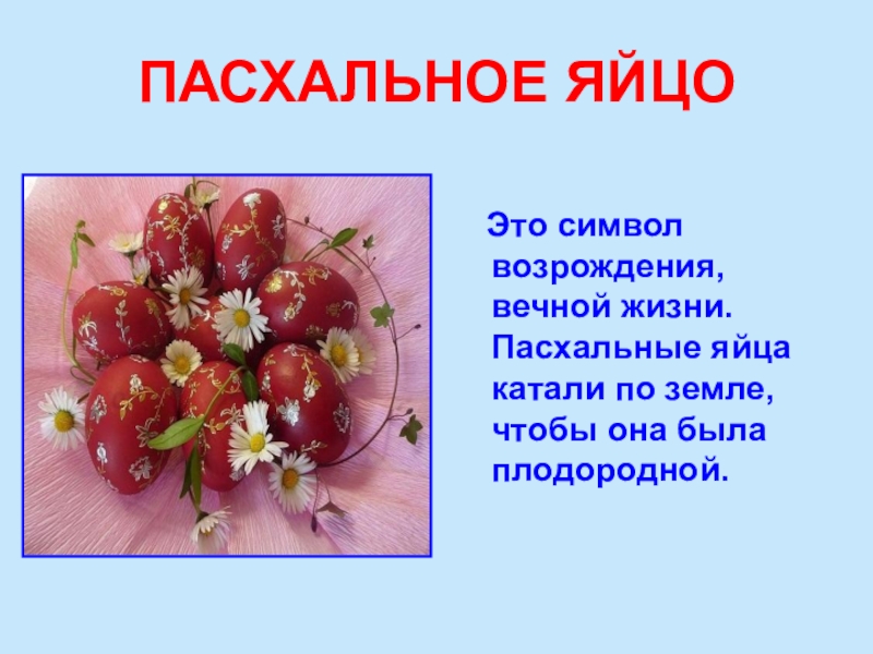 ПАСХАЛЬНОЕ ЯЙЦО   Это символ возрождения, вечной жизни. Пасхальные яйца катали по земле, чтобы она была