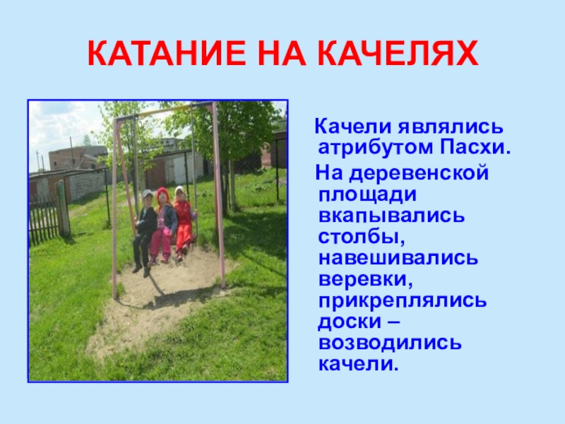 КАТАНИЕ НА КАЧЕЛЯХ     Качели являлись атрибутом Пасхи.  На деревенской площади вкапывались столбы,