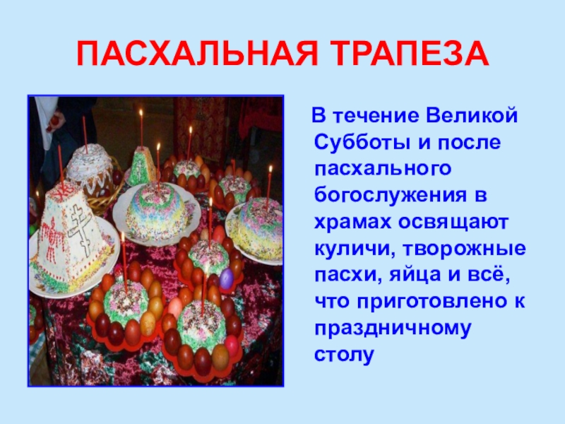 ПАСХАЛЬНАЯ ТРАПЕЗА  В течение Великой Субботы и после пасхального богослужения в храмах освящают куличи, творожные пасхи,