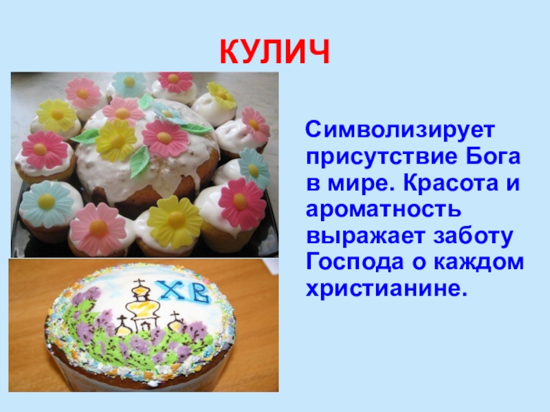 КУЛИЧ     Символизирует присутствие Бога в мире. Красота и ароматность выражает заботу Господа о