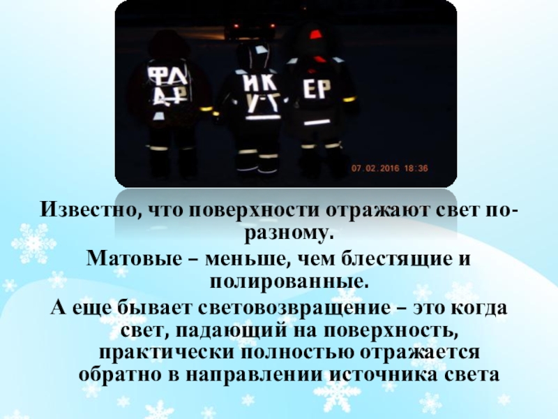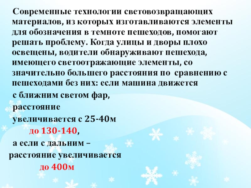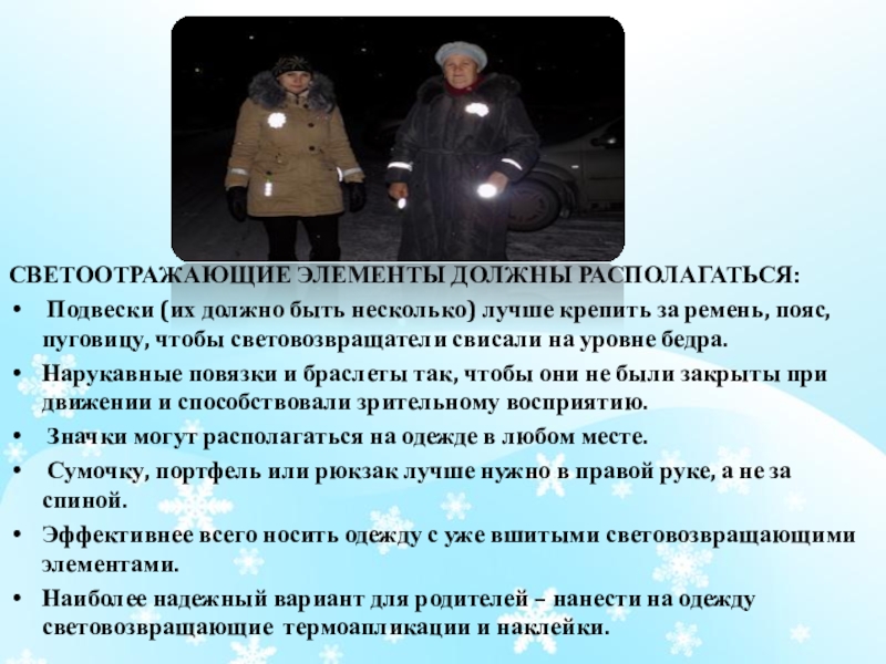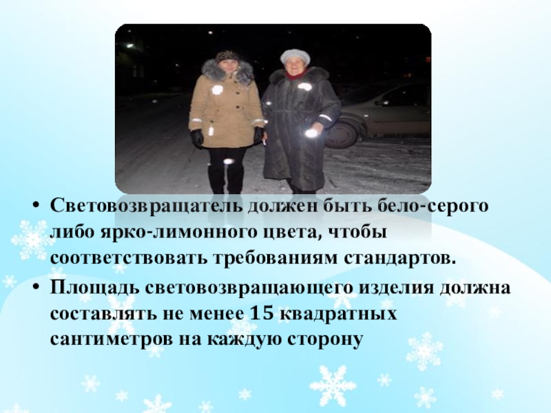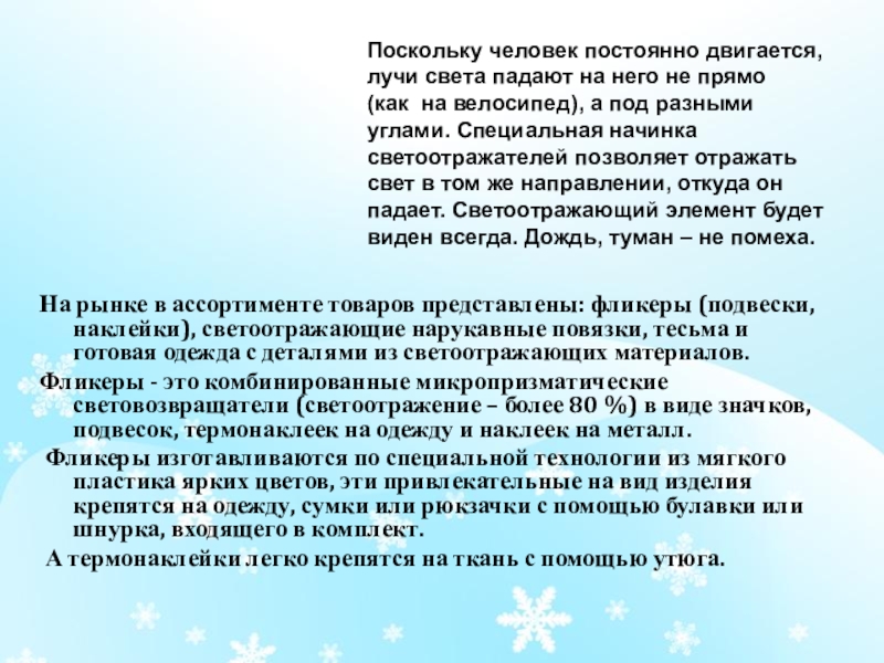 Поскольку человек постоянно двигается, лучи света падают на него не прямо (как на велосипед), а под разными углами. Специальная начинка светоотражателей позволяет отражать свет в том же направлении, откуда он падает. Светоотражающий элемент будет виден всегда. Дождь, туман – не помеха.