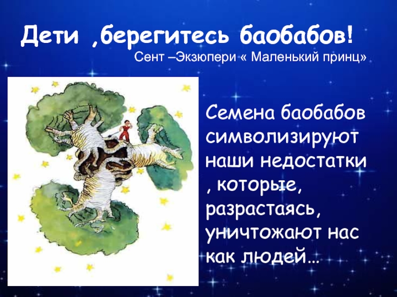Семена баобабов символизируют наши недостатки , которые, разрастаясь, уничтожают нас как людей…