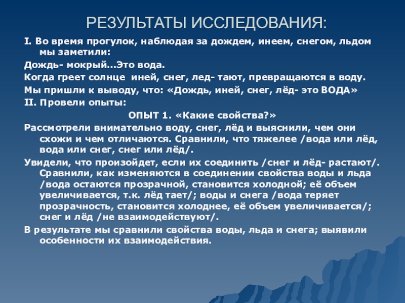 В результате мы сравнили свойства воды, льда и снега; выявили особенности их взаимодействия.