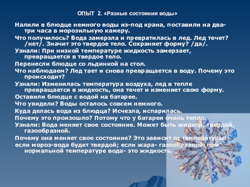 Слайд 8ОПЫТ 2. «Разные состояния воды»
