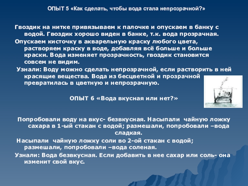 ОПЫТ 5 «Как сделать, чтобы вода стала непрозрачной?»