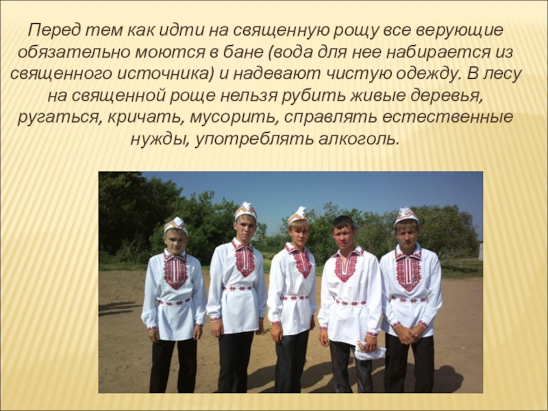 в бане (вода для нее набирается из священного источника) и надевают чистую одежду. В лесу на священной роще нельзя рубить живые деревья, ругаться, кричать, мусорить, справлять естественные нужды, употреблять алкоголь.