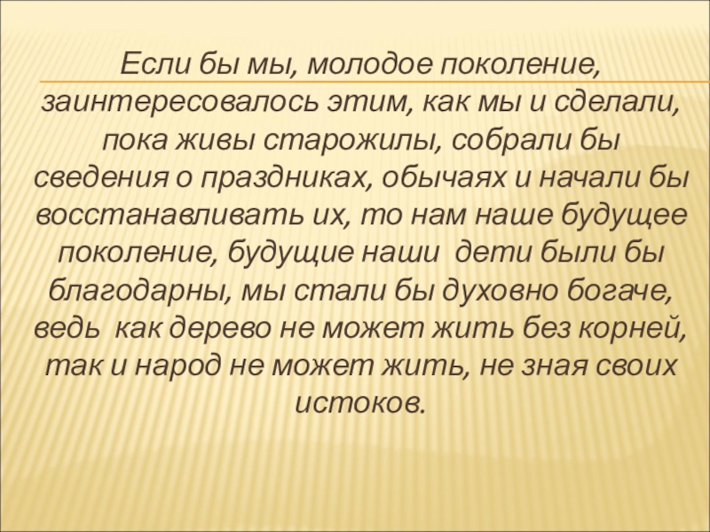 пока живы старожилы, собрали бы сведения о праздниках, обычаях и начали бы восстанавливать их, то нам наше будущее поколение, будущие наши дети были бы благодарны, мы стали бы духовно богаче, ведь как дерево не может жить без корней, так и народ не может жить, не зная своих истоков.