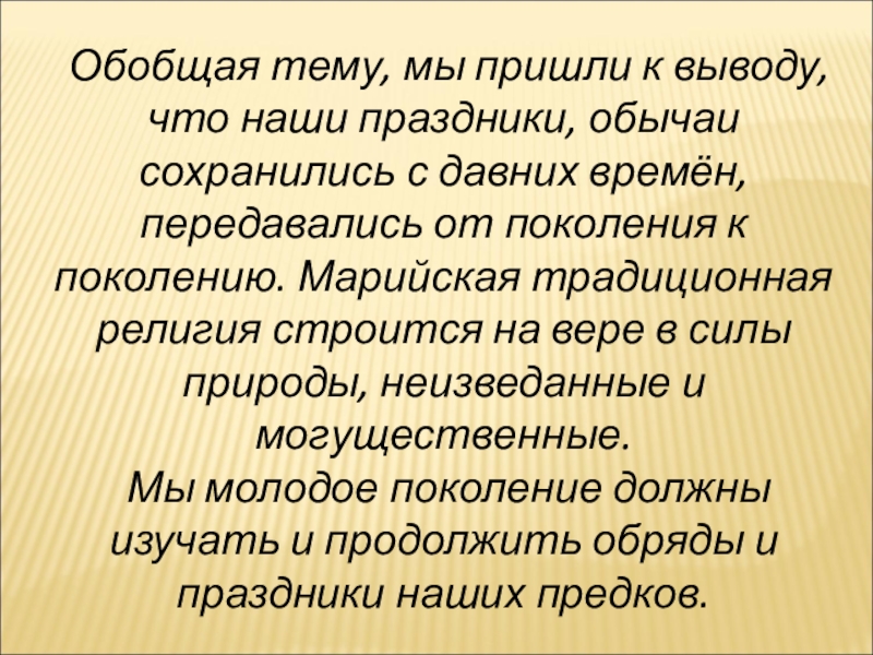 Слайд 26 Обобщая тему, мы пришли к выводу, что наши праздники, обычаи