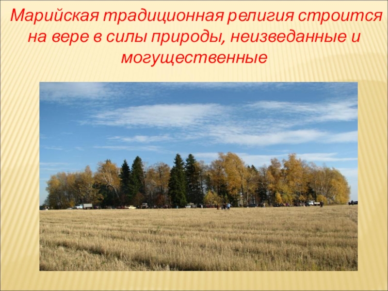 Слайд 7 Марийская традиционная религия строится на вере в силы природы, неизведанные