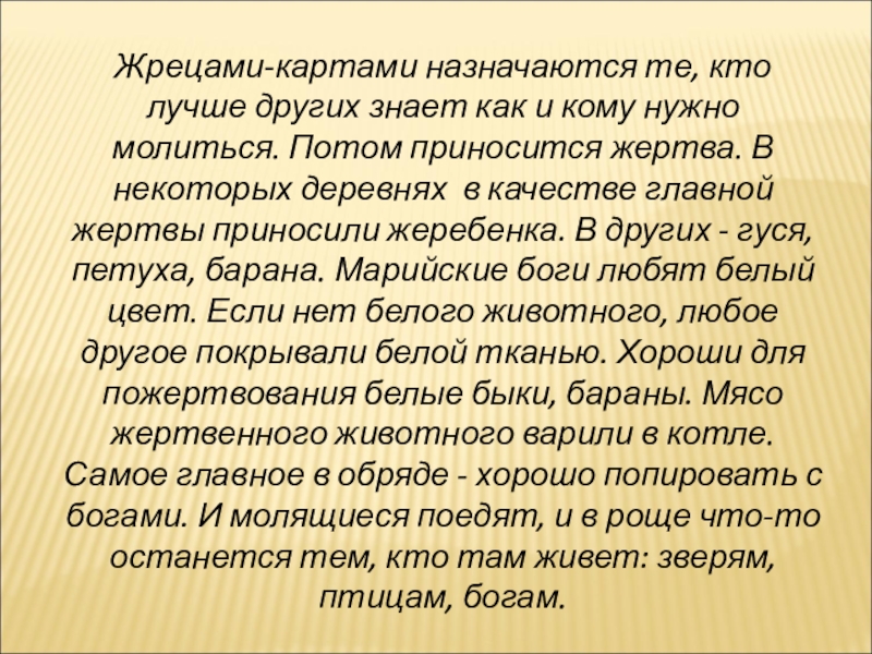 молиться. Потом приносится жертва. В некоторых деревнях в качестве главной жертвы приносили жеребенка. В других - гуся, петуха, барана. Марийские боги любят белый цвет. Если нет белого животного, любое другое покрывали белой тканью. Хороши для пожертвования белые быки, бараны. Мясо жертвенного животного варили в котле. Самое главное в обряде - хорошо попировать с богами. И молящиеся поедят, и в роще что-то останется тем, кто там живет: зверям, птицам, богам.