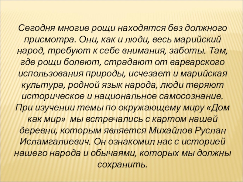 весь марийский народ, требуют к себе внимания, заботы. Там, где рощи болеют, страдают от варварского использования природы, исчезает и марийская культура, родной язык народа, люди теряют историческое и национальное самосознание. При изучении темы по окружающему миру «Дом как мир» мы встречались с картом нашей деревни, которым является Михайлов Руслан Исламгалиевич. Он ознакомил нас с историей нашего народа и обычаями, которых мы должны сохранить.