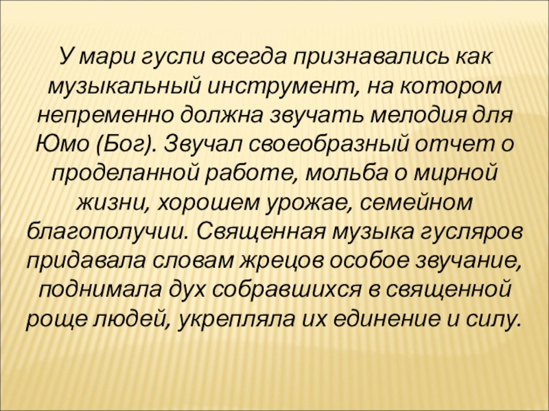 Слайд 10У мари гусли всегда признавались как музыкальный инструмент, на котором непременно