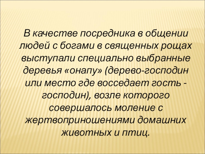 выступали специально выбранные деревья «онапу» (дерево-господин или место где восседает гость - господин), возле которого совершалось моление с жертвоприношениями домашних животных и птиц.