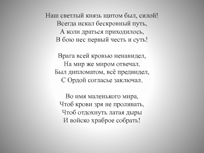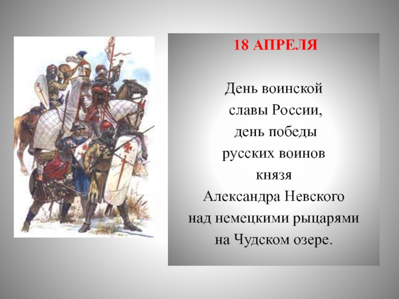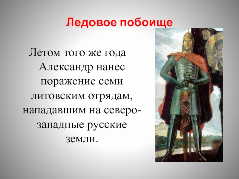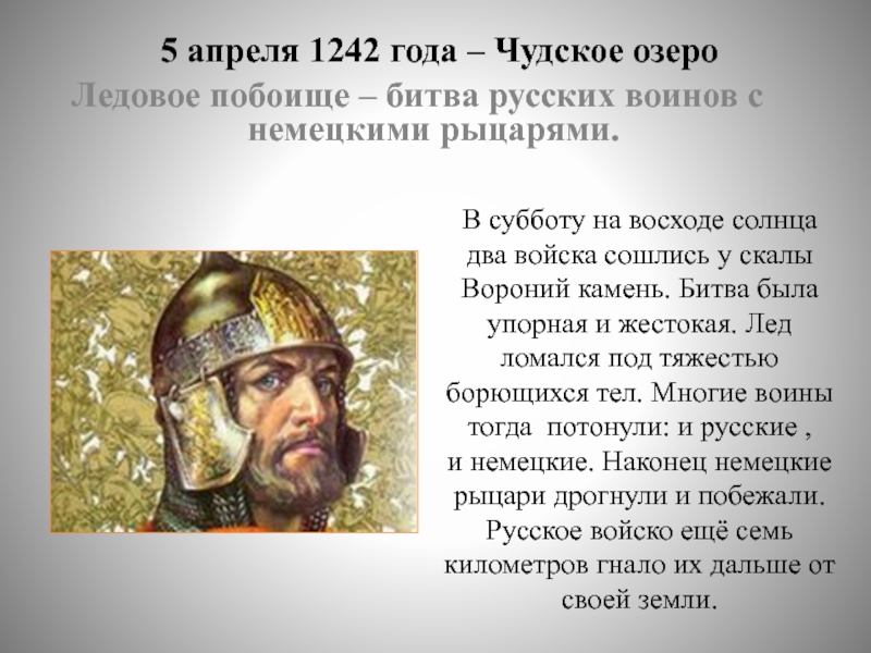 В субботу на восходе солнца два войска сошлись у скалы Вороний камень. Битва была упорная и жестокая. Лед ломался под тяжестью борющихся тел. Многие воины тогда потонули: и русские , и немецкие. Наконец немецкие рыцари дрогнули и побежали. Русское войско ещё семь километров гнало их дальше от своей земли.