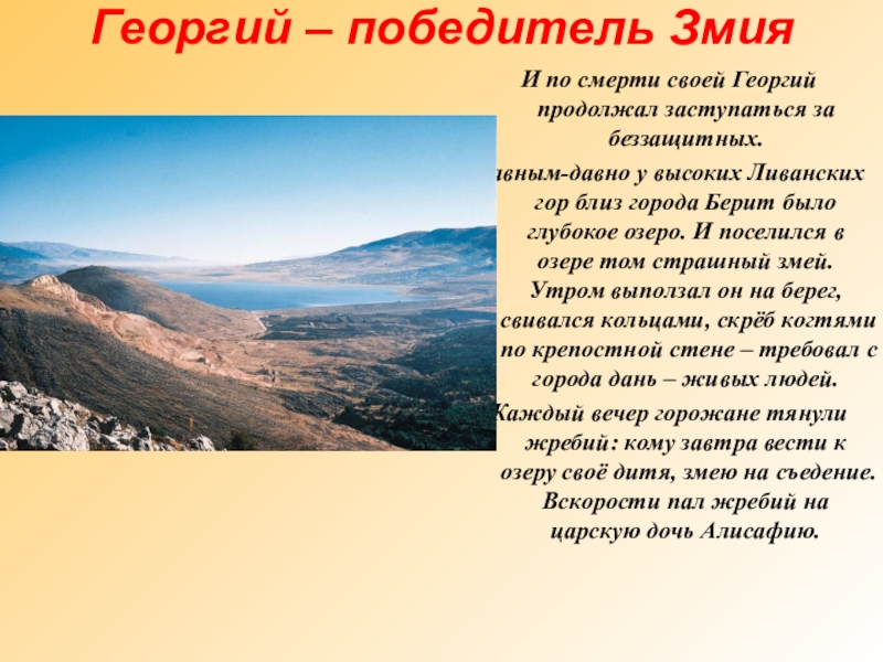 Давным-давно у высоких Ливанских гор близ города Берит было глубокое озеро. И поселился в озере том страшный змей. Утром выползал он на берег, свивался кольцами, скрёб когтями по крепостной стене – требовал с города дань – живых людей.