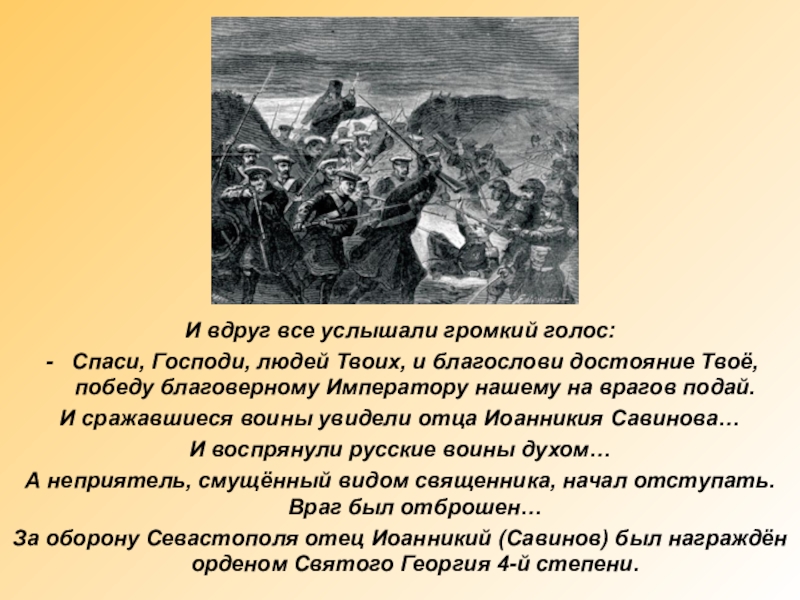 А неприятель, смущённый видом священника, начал отступать. Враг был отброшен…