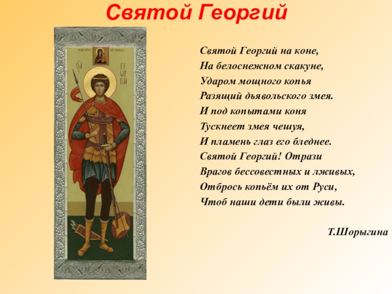 - Верую… - тихо шептал Георгий… Зашатался от боли и рухнул на мраморные плиты… В то же мгновенье гром прогремел в зале, и ангел встал рядом с мучеником… Провёл ладонью по кровавым ранам Георгия – раны затянулись…