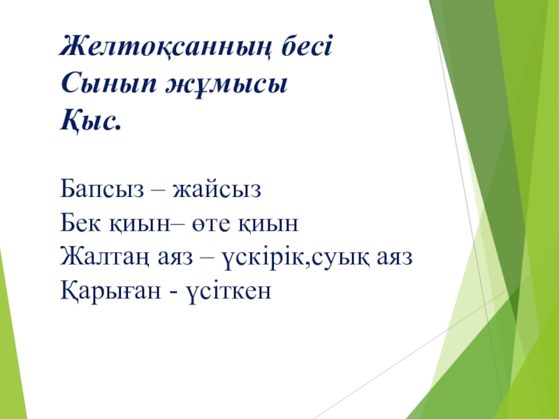 Желтоқсанның бесі Сынып жұмысы Қыс.  Бапсыз – жайсыз Бек қиын– өте қиын Жалтаң аяз – үскірік,суық