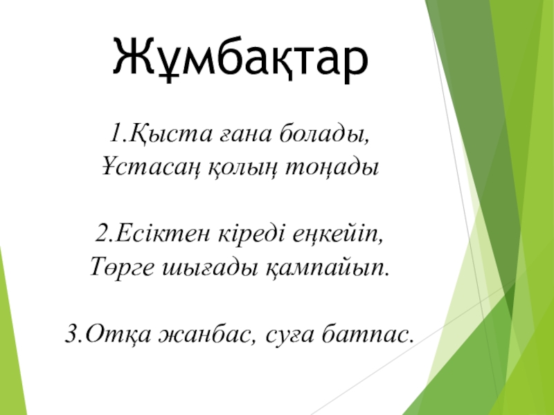 1.Қыста ғана болады, Ұстасаң қолың тоңады2.Есіктен кіреді еңкейіп,Төрге шығады қампайып.3.Отқа жанбас, суға батпас.Жұмбақтар