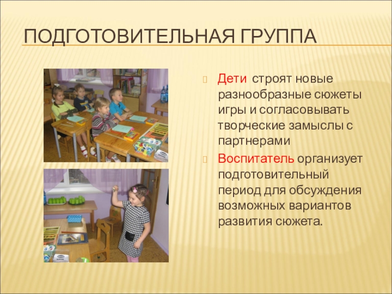 ПОДГОТОВИТЕЛЬНАЯ ГРУППАДети строят новые разнообразные сюжеты игры и согласовывать творческие замыслы с партнерамиВоспитатель организует подготовительный период для