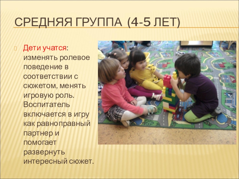 СРЕДНЯЯ ГРУППА (4-5 ЛЕТ)Дети учатся: изменять ролевое поведение в соответствии с сюжетом, менять игровую роль. Воспитатель включается
