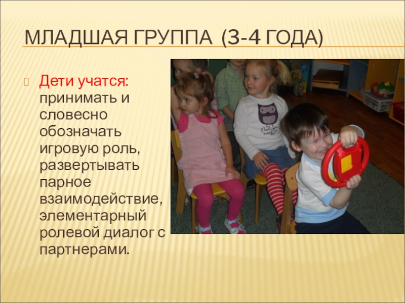 МЛАДШАЯ ГРУППА (3-4 ГОДА)Дети учатся: принимать и словесно обозначать игровую роль, развертывать парное взаимодействие, элементарный ролевой диалог с партнерами.