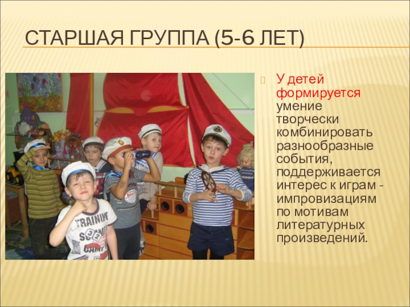 СТАРШАЯ ГРУППА (5-6 ЛЕТ)У детей формируется умение творчески комбинировать разнообразные события, поддерживается интерес к играм -импровизациям по