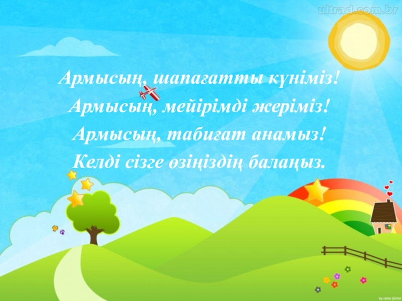 Армысың, шапағатты күніміз!Армысың, мейірімді жеріміз!Армысың, табиғат анамыз!Келді сізге өзіңіздің балаңыз.