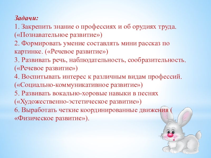 Задачи:1. Закрепить знание о профессиях и об орудиях труда. («Познавательное развитие»)2. Формировать умение составлять мини рассказ по картинке. («Речевое развитие»)3. Развивать речь, наблюдательность, сообразительность. («Речевое развитие»)4. Воспитывать интерес к различным видам профессий. («Социально-коммуникативное развитие»)5. Развивать вокально-хоровые