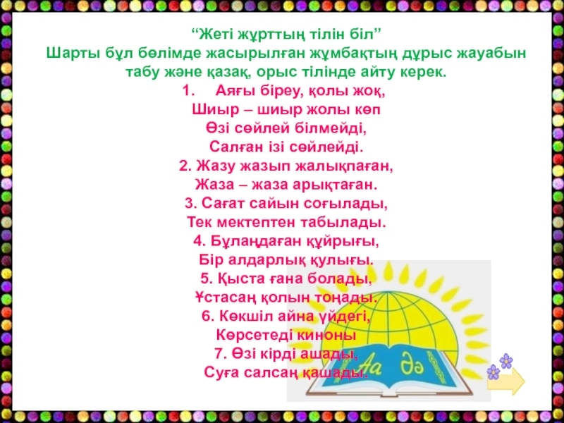 Шарты бұл бөлімде жасырылған жұмбақтың дұрыс жауабын табу