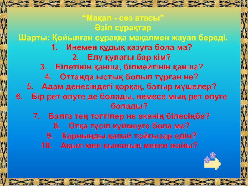 Шарты: Қойылған сұраққа мақалмен жауап береді.