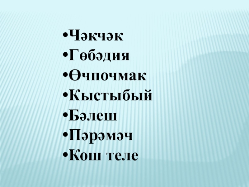 ЧәкчәкГөбәдияӨчпочмакКыстыбыйБәлешПәрәмәчКош теле