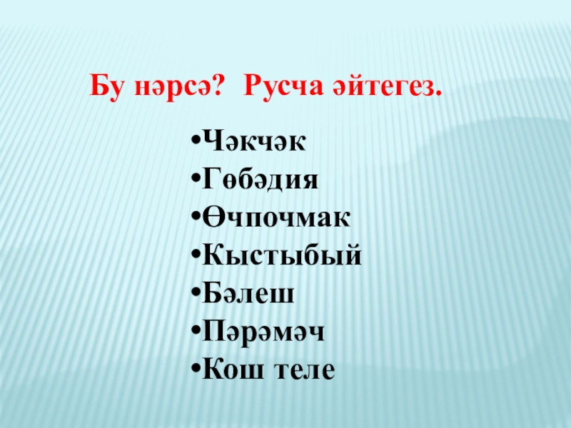 ЧәкчәкГөбәдияӨчпочмакКыстыбыйБәлешПәрәмәчКош теле Бу нәрсә? Русча әйтегез.
