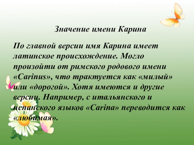 Слайд 24По главной версии имя Карина имеет латинское происхождение. Могло произойти от