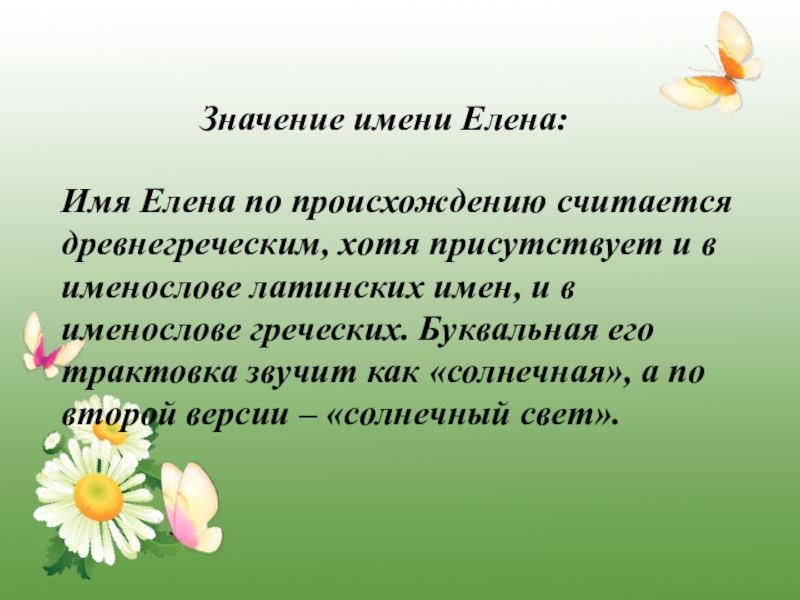 Слайд 35Имя Елена по происхождению считается древнегреческим, хотя присутствует и в именослове