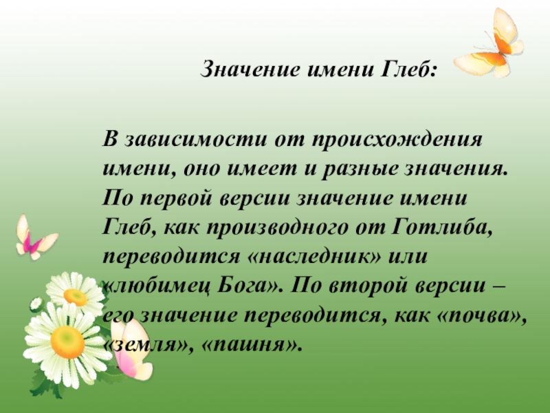 первой версии значение имени Глеб, как производного от Готлиба, переводится «наследник» или «любимец Бога». По второй версии – его значение переводится, как «почва», «земля», «пашня».