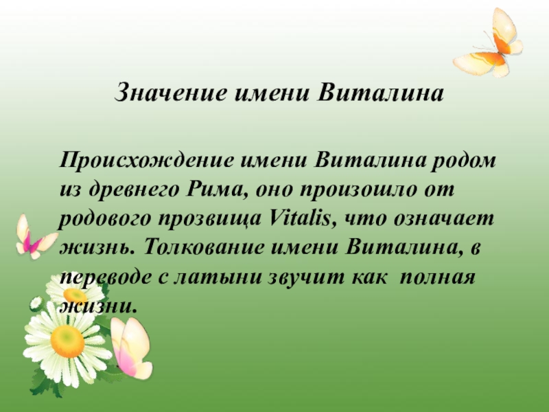 Слайд 22Происхождение имени Виталина родом из древнего Рима, оно произошло от родового