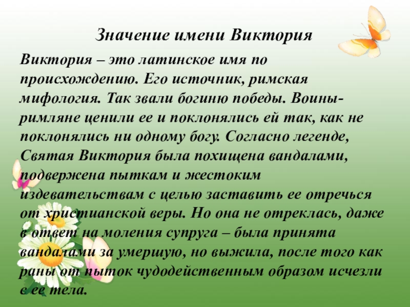 римская мифология. Так звали богиню победы. Воины-римляне ценили ее и поклонялись ей так, как не поклонялись ни одному богу. Согласно легенде, Святая Виктория была похищена вандалами, подвержена пыткам и жестоким издевательствам с целью заставить ее отречься от христианской веры. Но она не отреклась, даже в ответ на моления супруга – была принята вандалами за умершую, но выжила, после того как раны от пыток чудодейственным образом исчезли с ее тела.