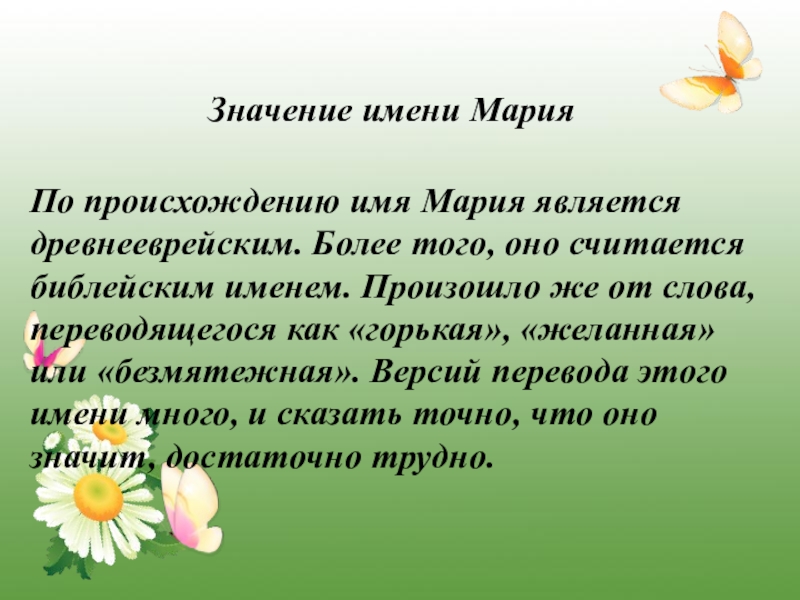 Слайд 26По происхождению имя Мария является древнееврейским. Более того, оно считается библейским