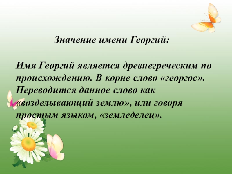 Слайд 39Имя Георгий является древнегреческим по происхождению. В корне слово «георгос». Переводится