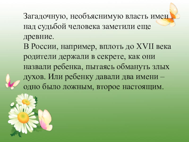 родители держали в секрете, как они назвали ребенка, пытаясь обмануть злых духов. Или ребенку давали два имени –