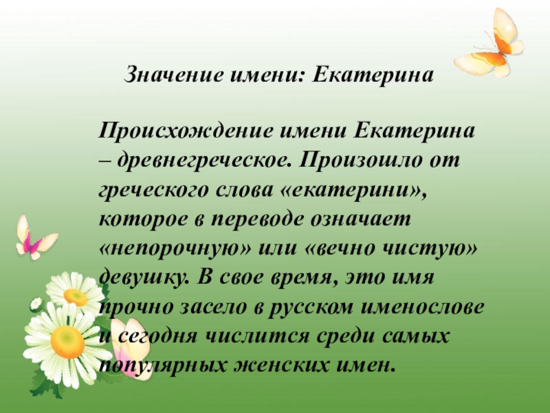 Слайд 19Происхождение имени Екатерина – древнегреческое. Произошло от греческого слова «екатерини», которое