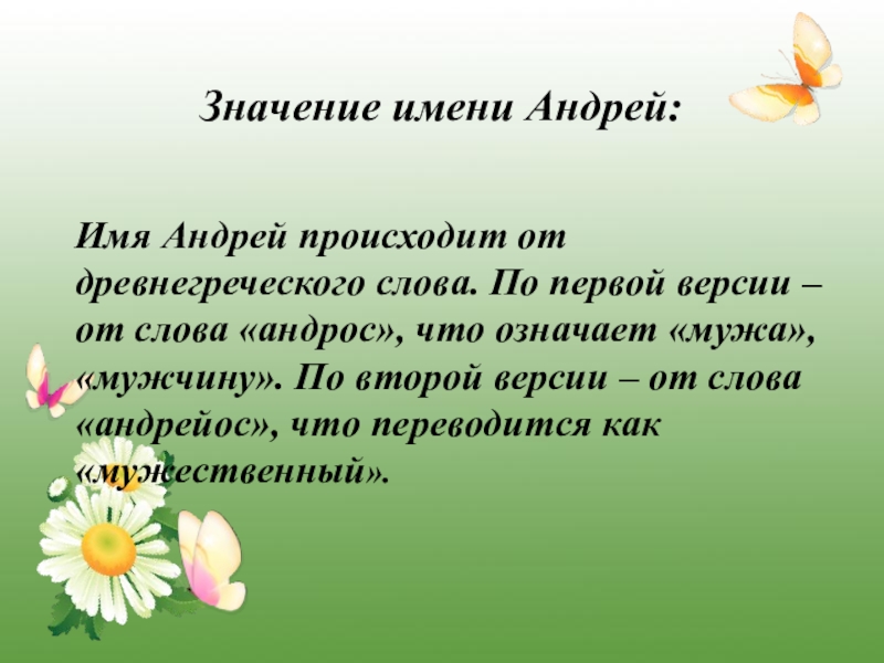 слова «андрос», что означает «мужа», «мужчину». По второй версии – от слова «андрейос», что переводится как «мужественный».