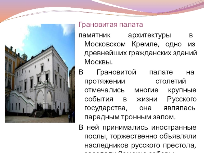 В ней принимались иностранные послы, торжественно объявляли наследников русского престола, заседали Земские соборы.